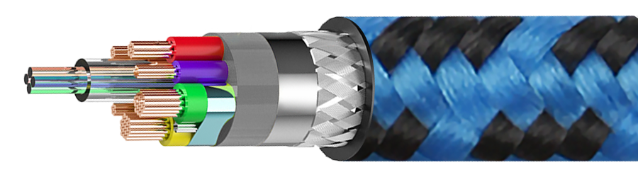 Das Kabel kombiniert vier OM3-Multimode-Glasfaserkerne für die Hochgeschwindigkeitsdatenkanäle und sieben OFC-Kupferleiter für Stromversorgung und Low-Speed-Signale. Die internen Wandlerchips im TX- und RX-Modul sorgen für präzise Signalaufbereitung und stabilen Datentransfer auch bei großen Entfernungen. Die Stecker sind in robusten Metallgehäusen untergebracht und mit 24k-vergoldeten Kontakten ausgestattet. Der Außenmantel aus PVC wird durch ein blau-schwarzes Baumwollgeflecht mechanisch verstärkt und ist gleichzeitig flexibel genug für enge Installationswege.