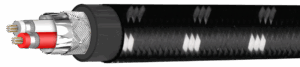 Die beiden Signalleiter bestehen aus jeweils 19 feindrahtigen OFC-Litzen mit Ø 0,127 mm. Die primäre PE-Isolierung Ø 1,8 mm wird durch eine FPE-Schicht Ø 3,0 mm ergänzt, die die elektrische Stabilität verbessert und die Kapazität reduziert. Eine Aluminiumfolie bildet die erste Schirmungsebene, darüber liegt ein eng geflochtenes Kupfergeflecht aus 128 verzinnten TC-Litzen mit Ø 0,12 mm.