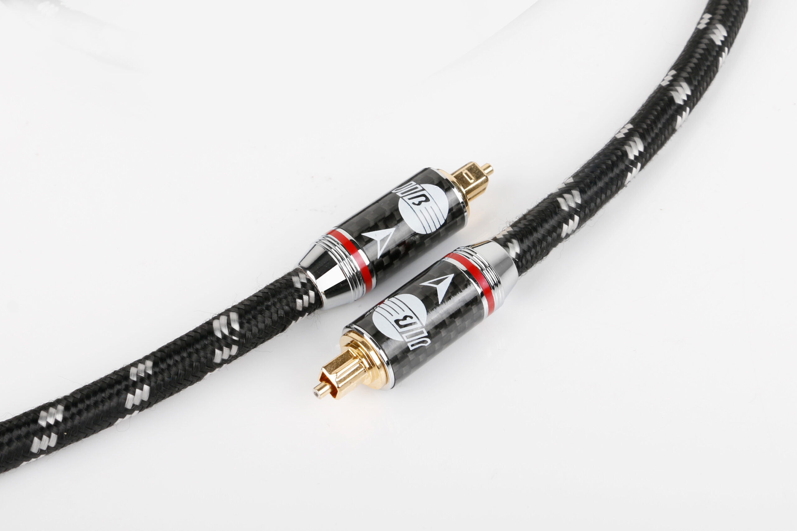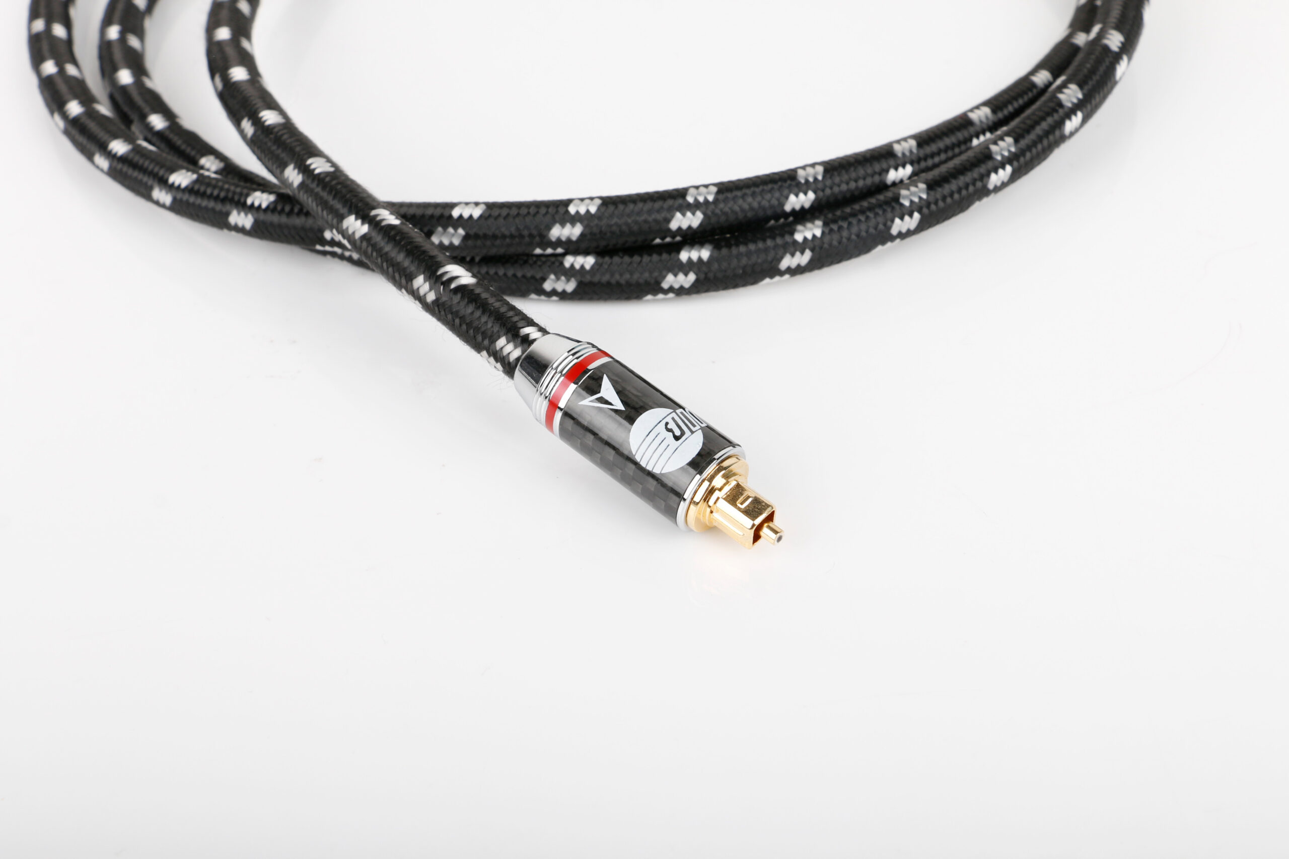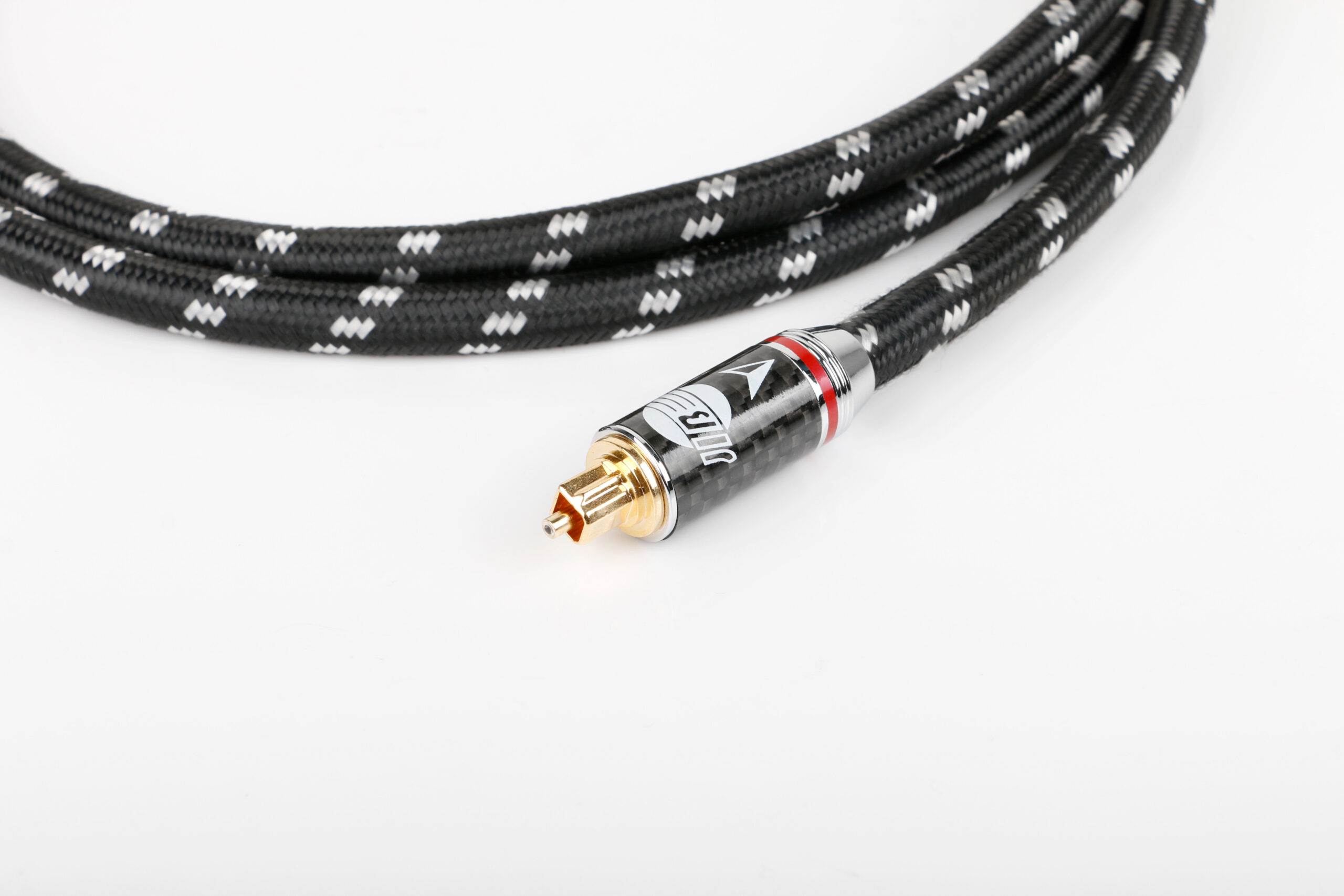 Der Außenmantel besteht aus widerstandsfähigem PVC mit einem robusten Baumwollgeflecht (schwarz/weiß). Diese Kombination bietet eine hohe Lebensdauer und schützt die Faser vor Beschädigung im alltäglichen Einsatz. Die vergoldeten Toslink-Stecker mit Metall- und Carbonfaserhülse gewährleisten eine präzise, sichere Verbindung und klare Richtungsführung durch Markierungsring und Pfeilkennzeichnung.